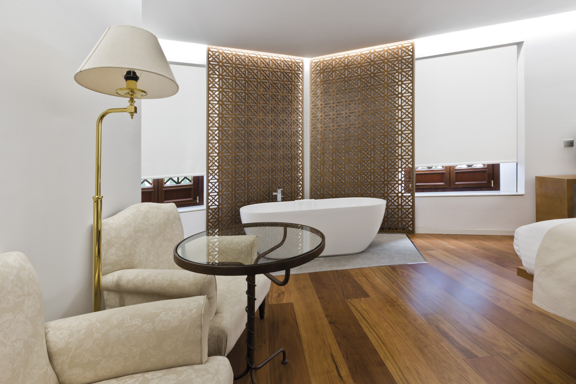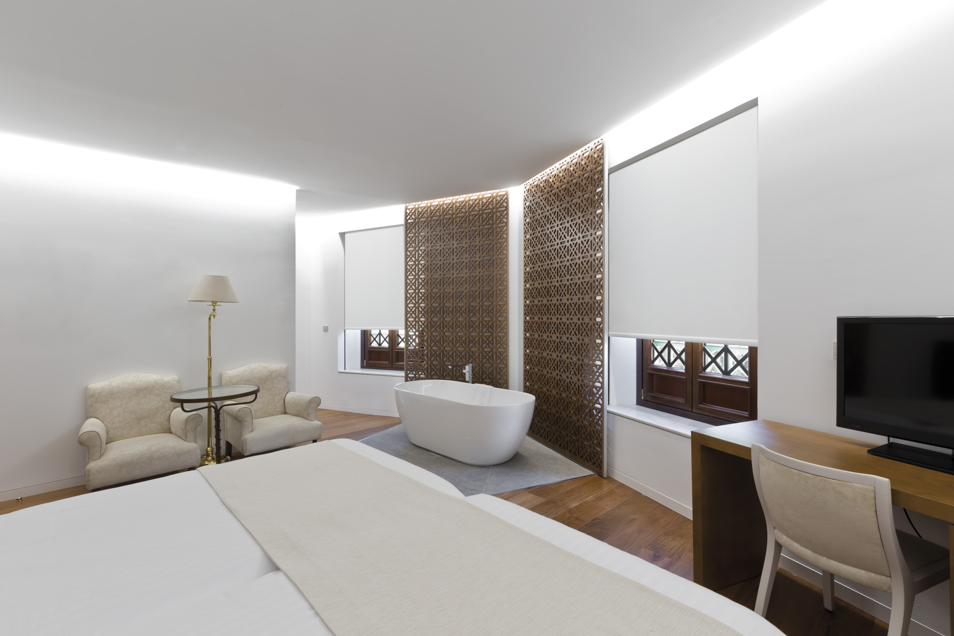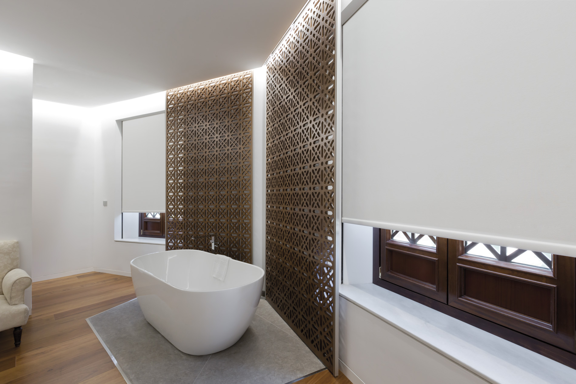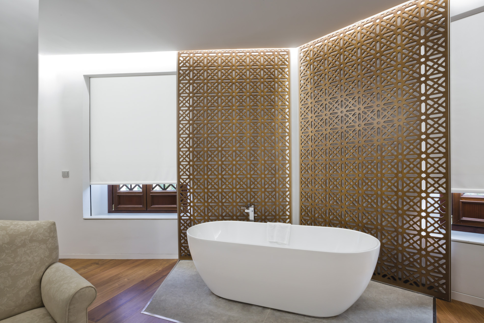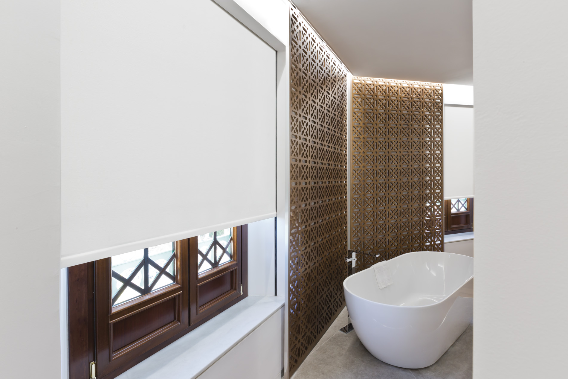 Los Estores enrollables de Saxun visten elegantemente las habitaciones de este exclusivo hotel nazarí, en un tejido black out, que impide el paso de la luz y garantiza la privacidad.