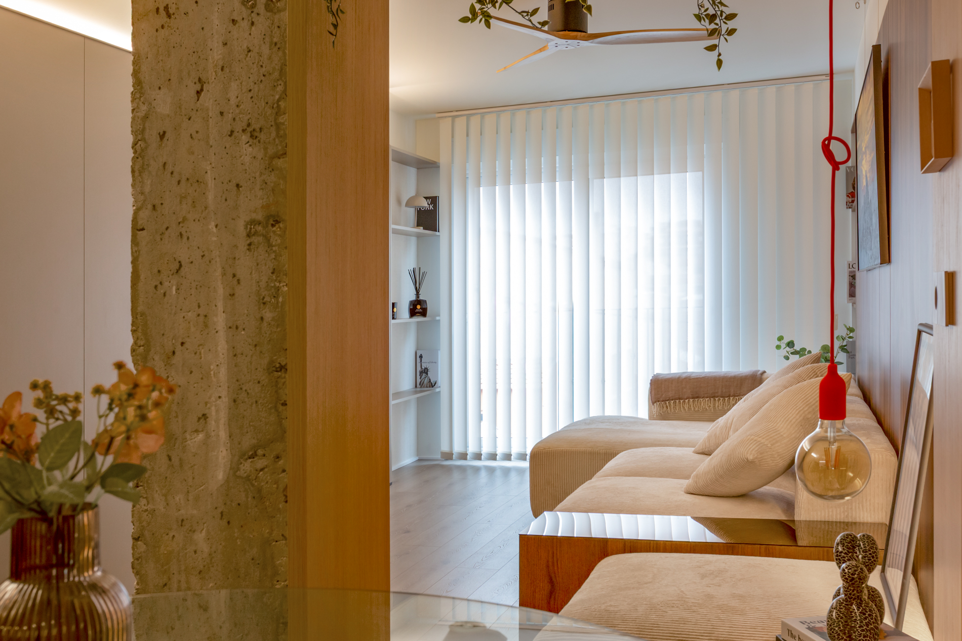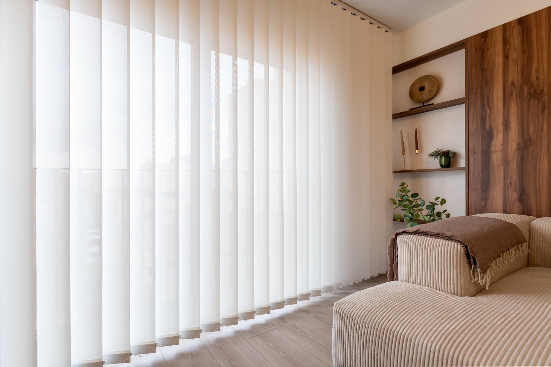 Durante la reforma de esta vivienda, uno de los objetivos principales fue potenciar la conexión entre estancias, fomentando espacios abiertos donde la luz natural fluyera libremente. Para lograrlo, se apostó por nuestras Cortinas verticales, una solución elegante, funcional y eficaz para regular la entrada de luz y ganar en privacidad.