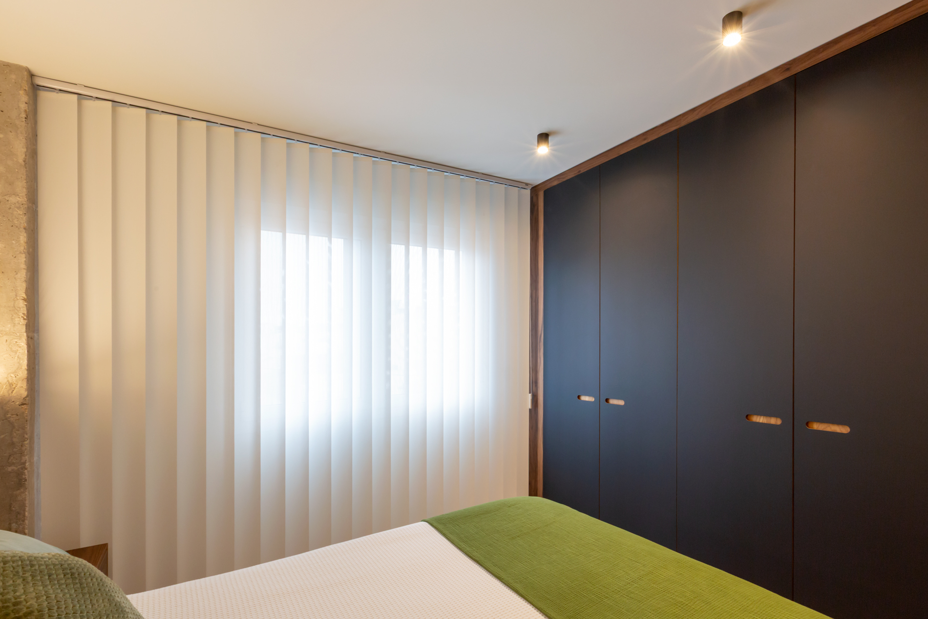 Para unificar visualmente los ambientes y mantener la coherencia del proyecto, todas las Cortinas verticales comparte ancho de lama, tejido y color. En concreto se ha optado por un ancho de 127, una medida media que se adapta a todo tipo de espacios, en tejido Sax Screen 3600, en color 3601 blanco neutro.