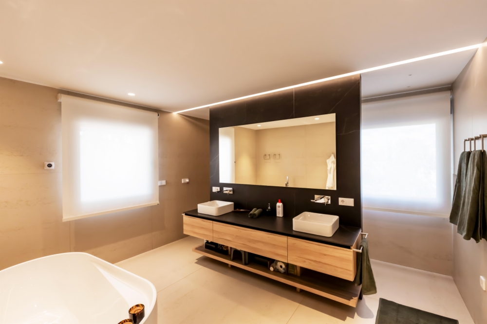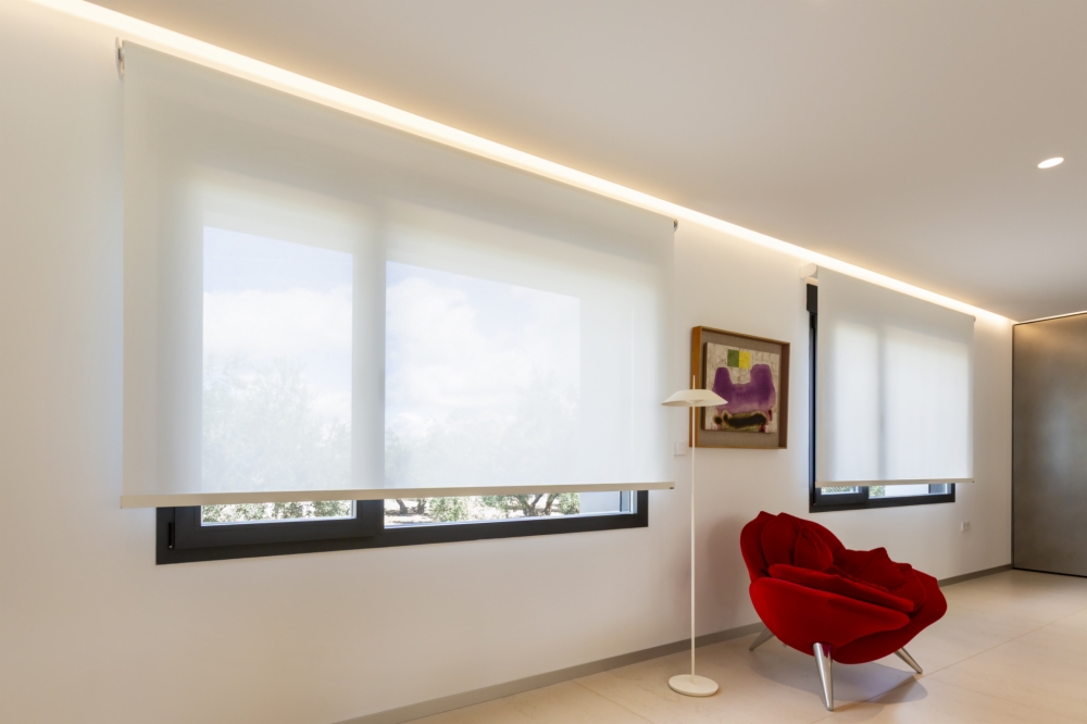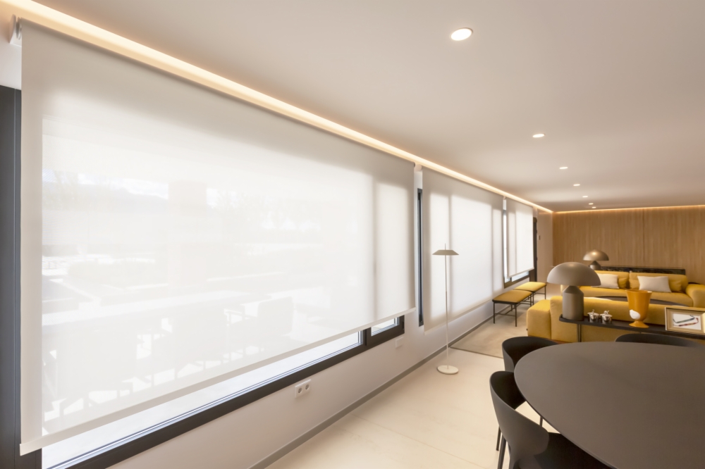 En total, se instalaron 32 Estores enrollables motorizados, diseñados a medida y con el mismo tejido, tono y apertura para lograr un acabado uniforme en toda la vivienda. El tejido elegido fue el Sax Screen 5500, con una apertura del 5%, ideal para viviendas con grandes ventanales y vistas al exterior. Esta apertura permite regular la entrada de luz natural, conservar las vistas panorámicas y, al mismo tiempo, mantener la privacidad según el momento del día.