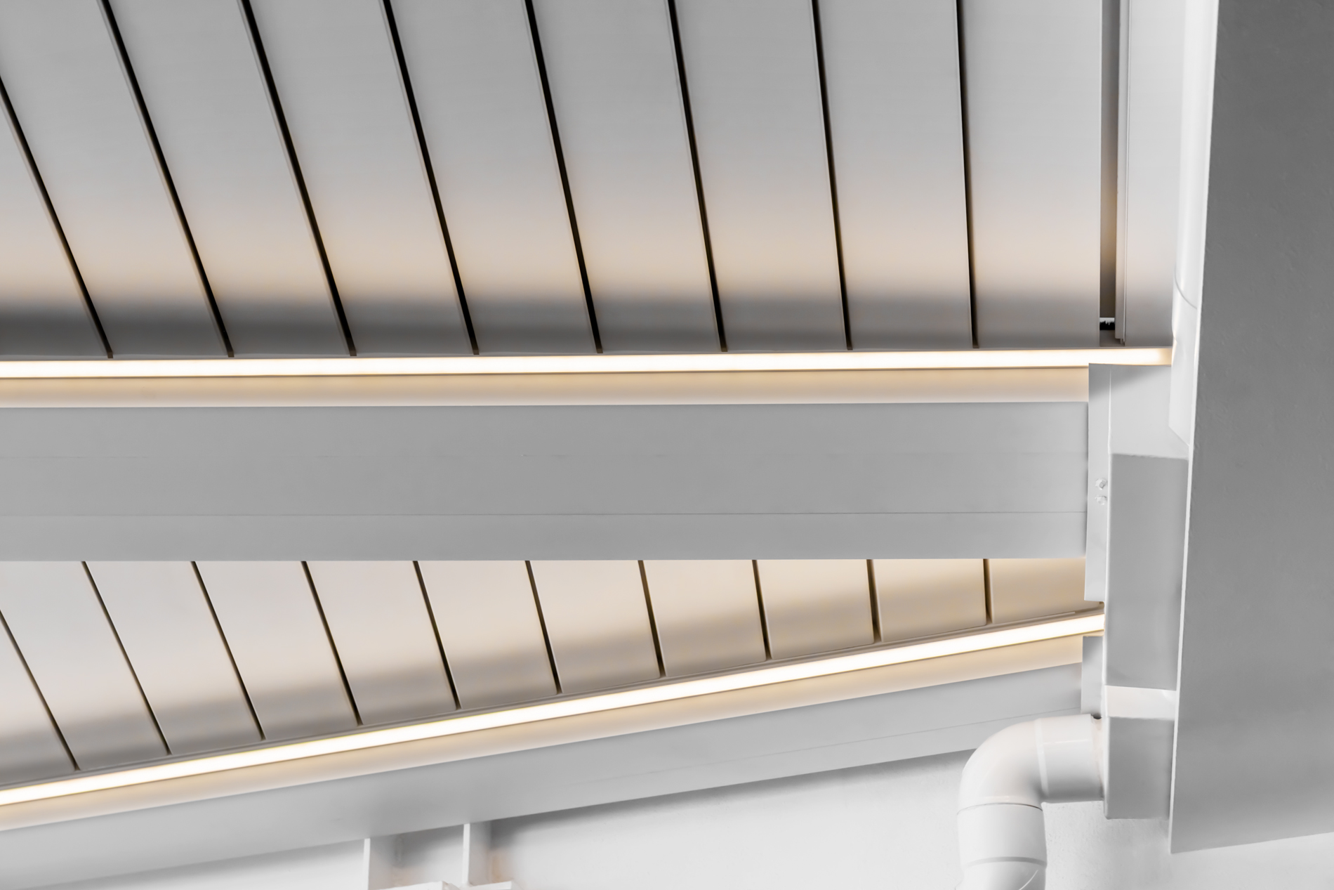 Producidas en RAL 9016 texturado, incorporan iluminación LED perimetral, creando una atmósfera agradable tanto de día como de noche.