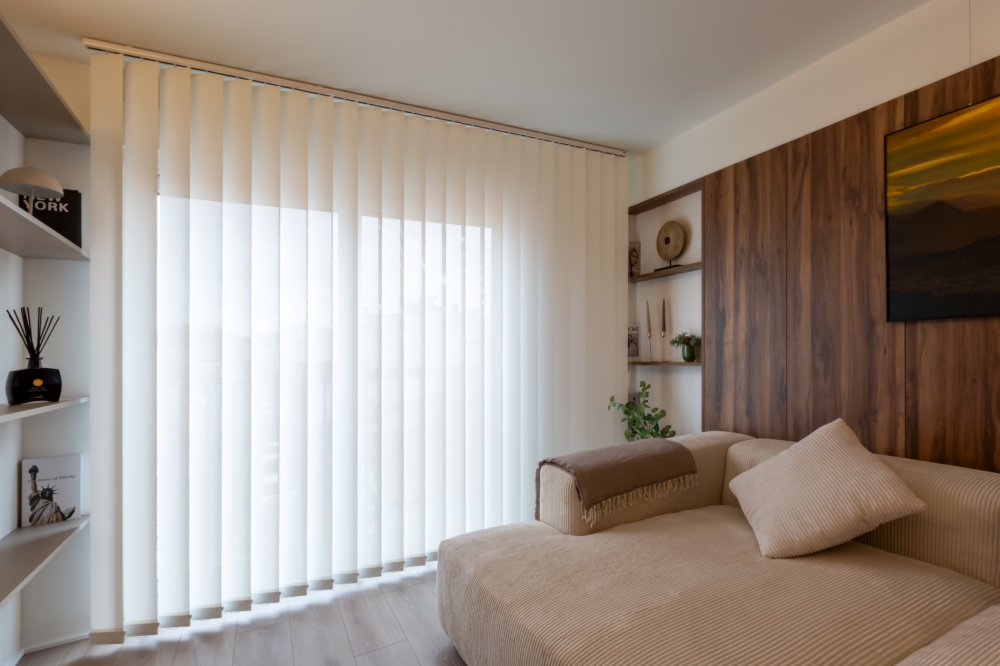 La Cortina vertical es un sistema de protección solar eficiente y estético, perfecto para ventanas de gran formato o puertas acristaladas que comunican con el exterior. Gracias a la graduación de sus lamas verticales, permite regular la entrada de luz y crear distintos ambientes según el momento del día.
