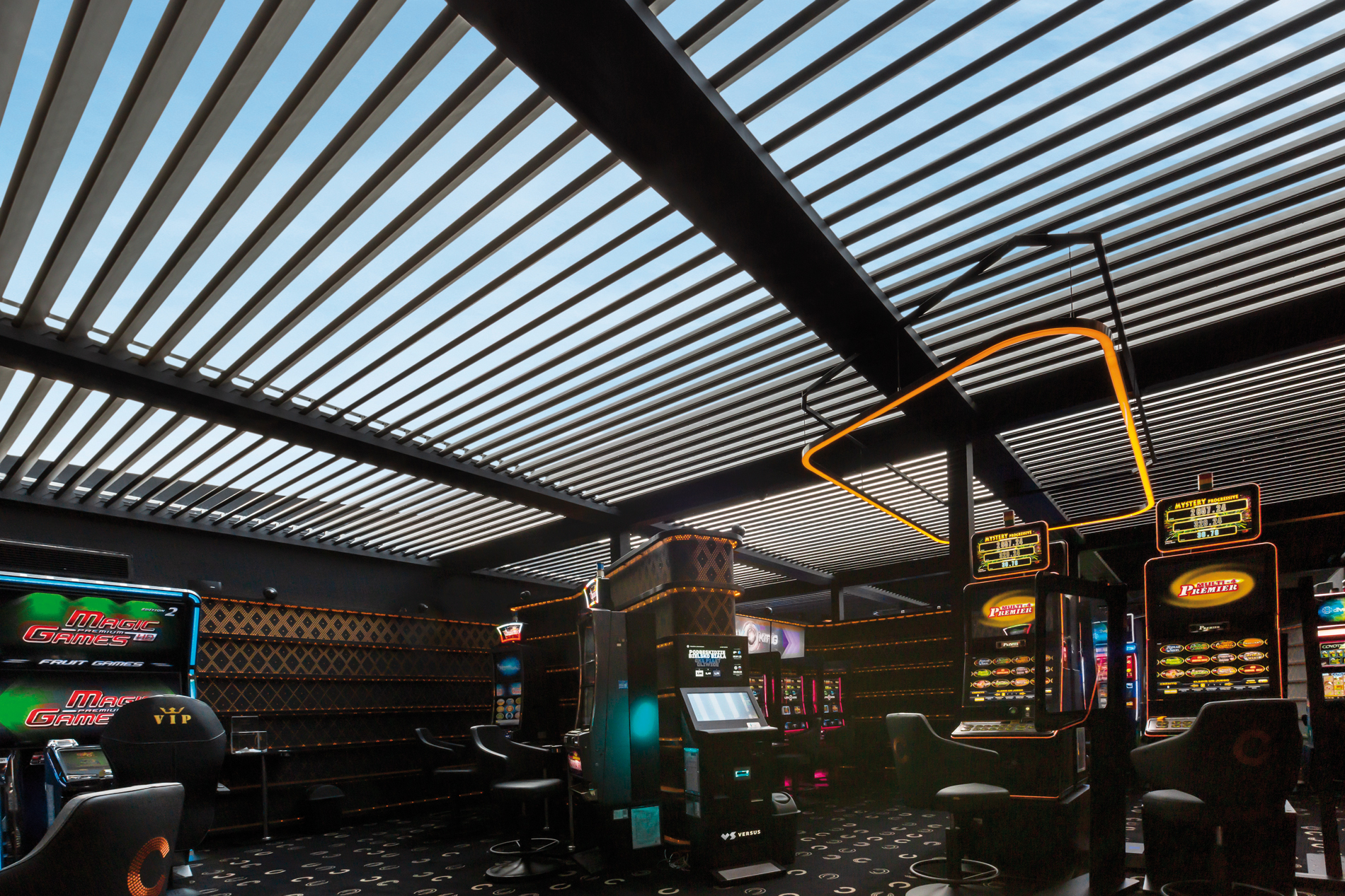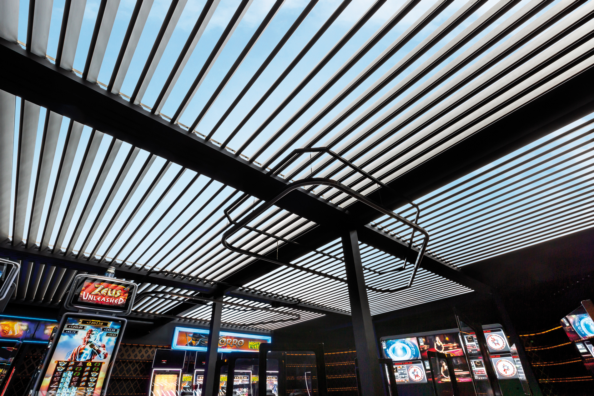 Y es que, con el objetivo de aumentar el valor del edificio, ampliar sus instalaciones y fusionar su arquitectura tradicional con el toque vanguardista que siempre aportan las líneas rectas, se ha construido un espacio anexo al tinglado principal enmarcado por celosías R-100 iluminadas y cubierto por veintiuna pérgolas bioclimáticas. Este espacio, en cuyo techo se combinan lamas móviles y fijas, alberga uno de los mayores salones de slot del Mediterráneo.