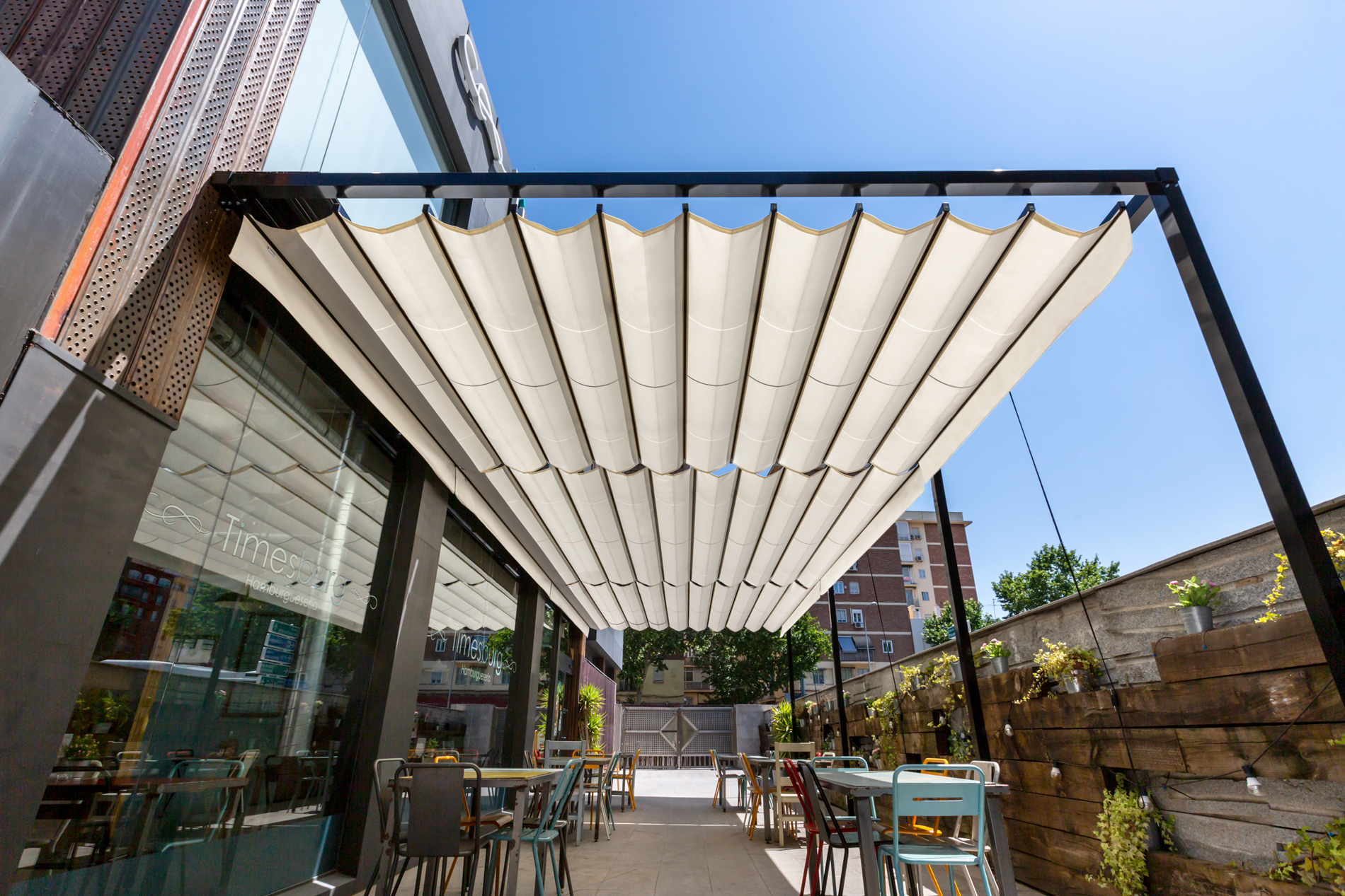 Con una estructura lacada en color RAL 9011 y complementada con una lona 2979 Perla se consigue el perfecto equilibrio entre la estética cuidada que requiere el gusto por los detalles de la propiedad y la funcionalidad práctica que demandan los comensales habituales, que acuden a vivir una experiencia gastronómica distinta a la que se vive en el resto de hamburgueserías tradicionales.