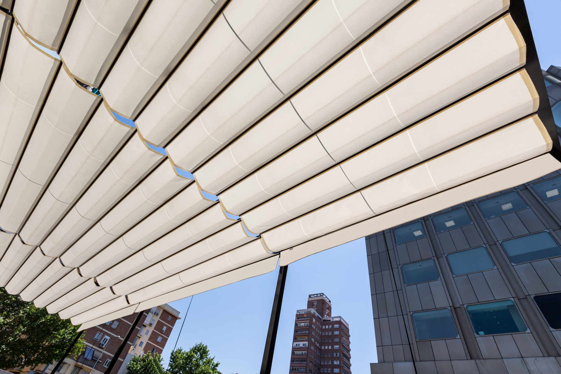 La palillería de este nuevo sistema Saxun integra iluminación LED evitando que la hora del día limite el uso del espacio, garantizando su disfrute también cuando cuando cae la noche madrileña.