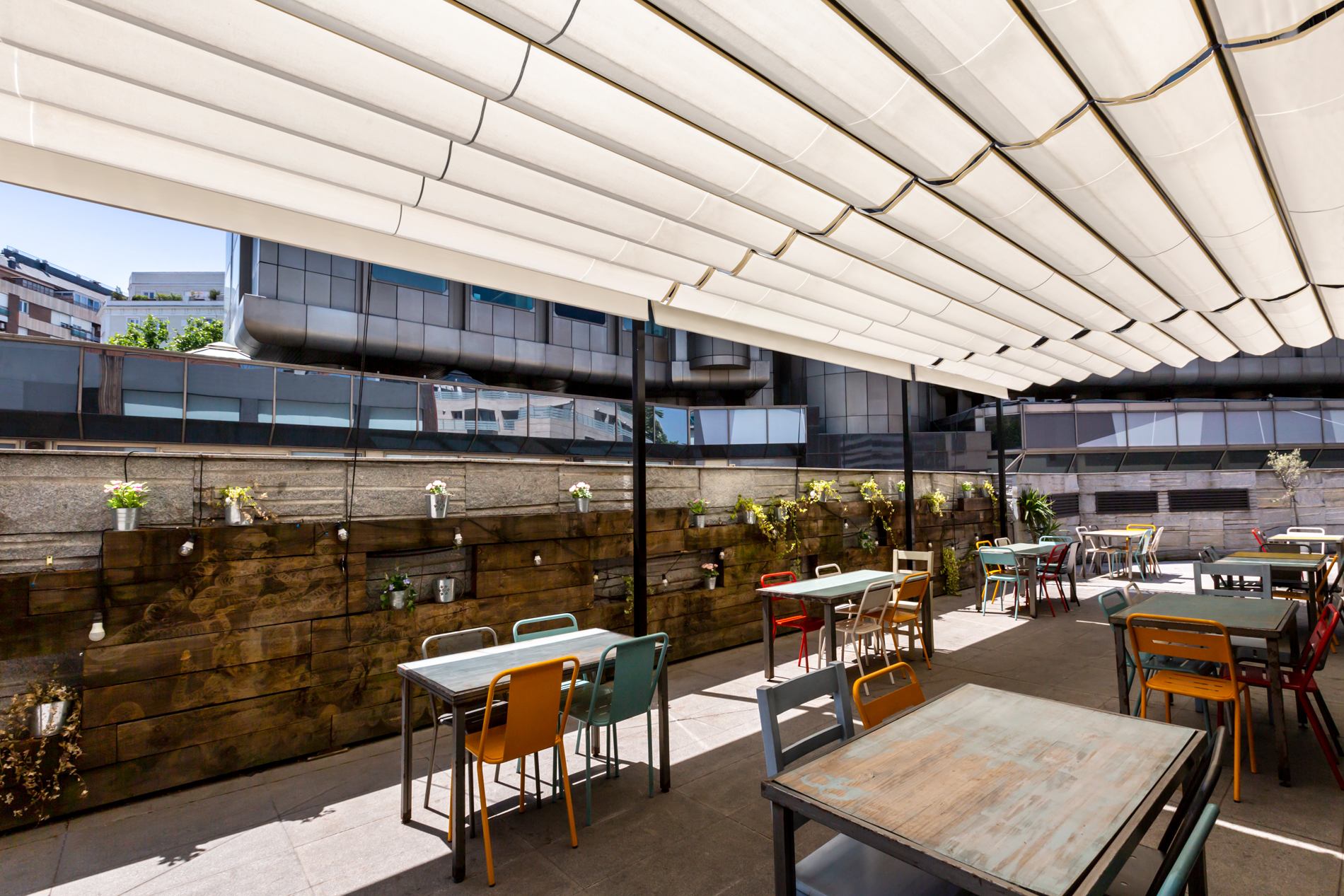 Las múltiples posibilidades que ofrece, tanto de instalación como de accionamiento, posibilitando además la automatización y domotización del mismo, hace que sea un producto muy versátil, con infinidad de configuraciones, apto para cualquier tipo de terrazas, bien sean residenciales o, como en este caso, de un negocio.