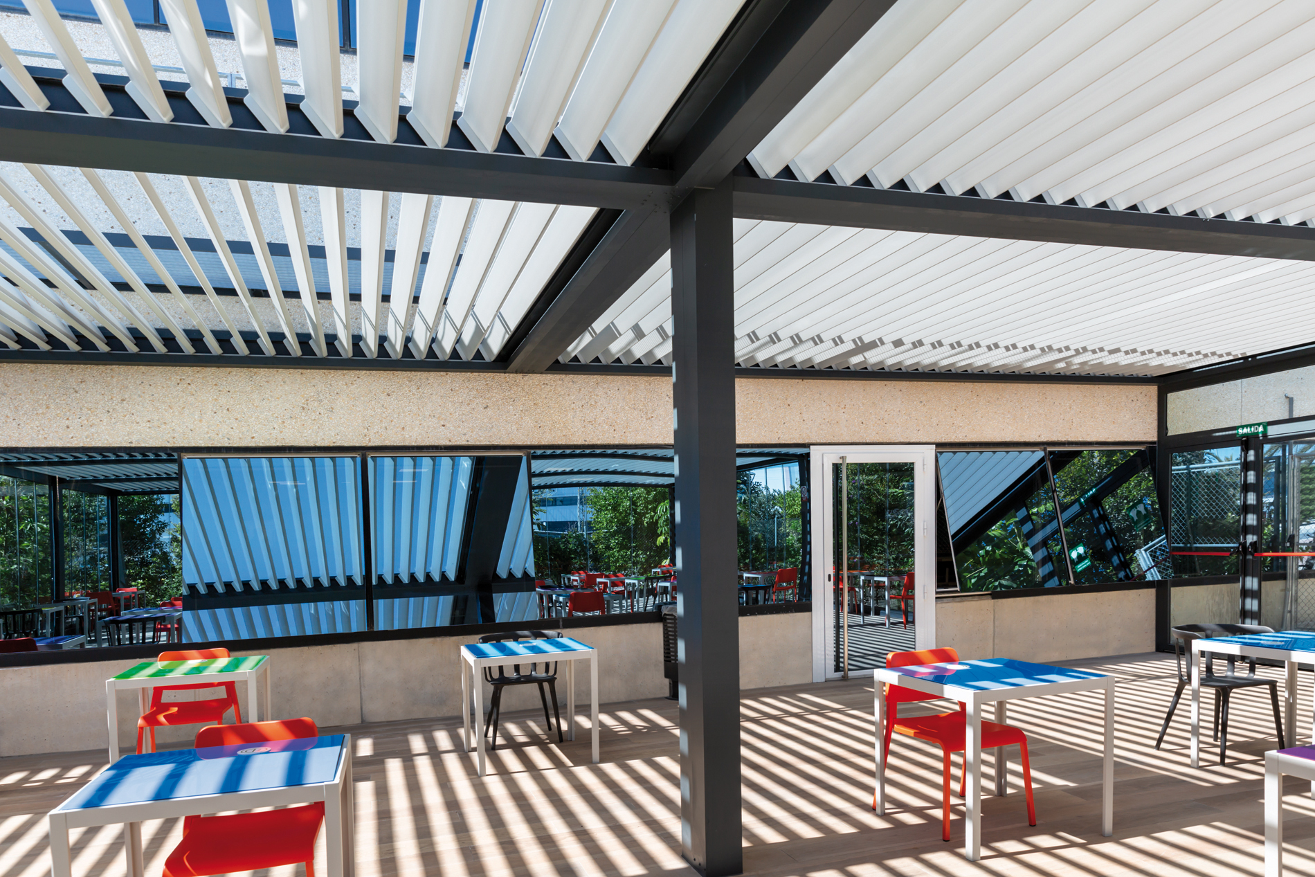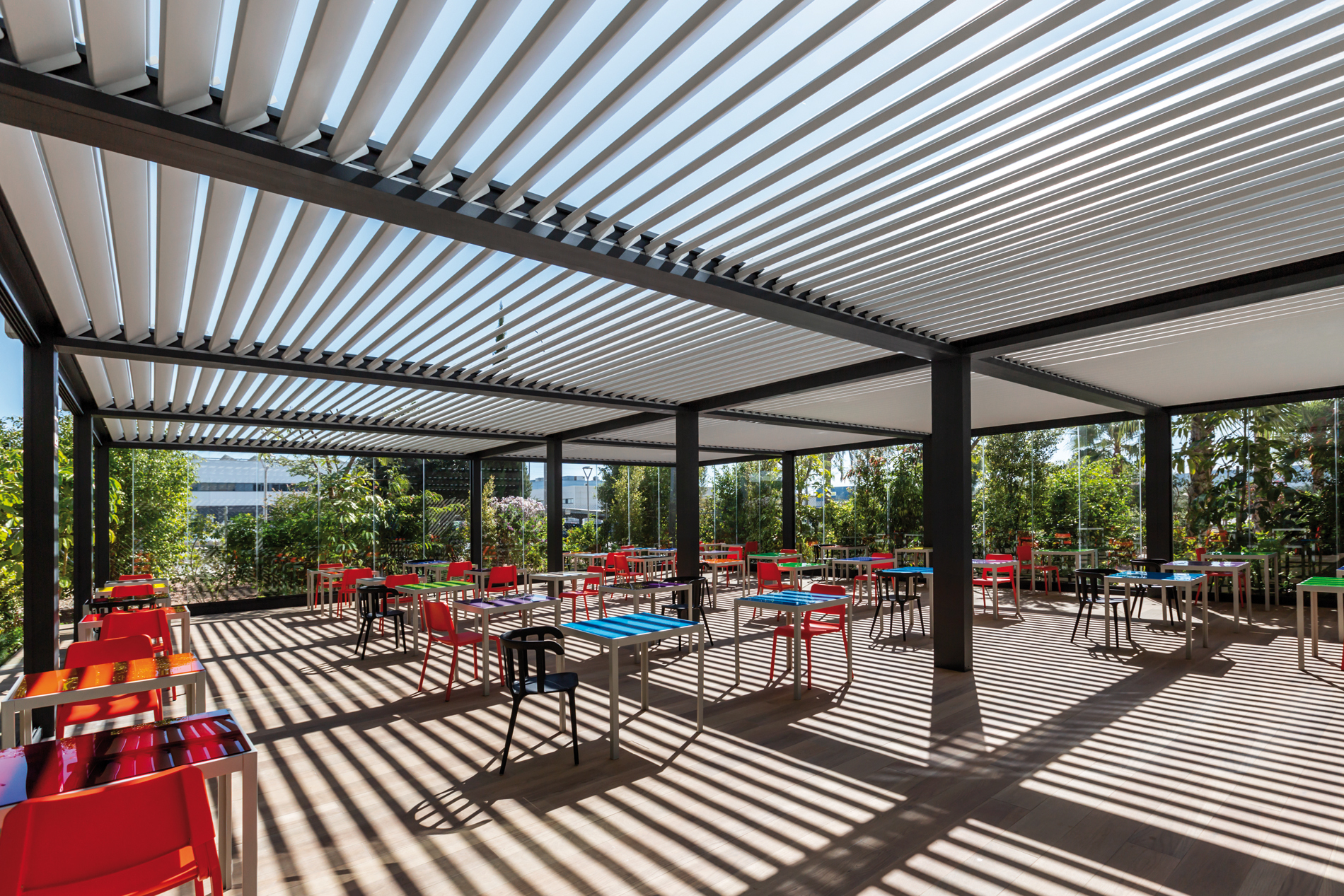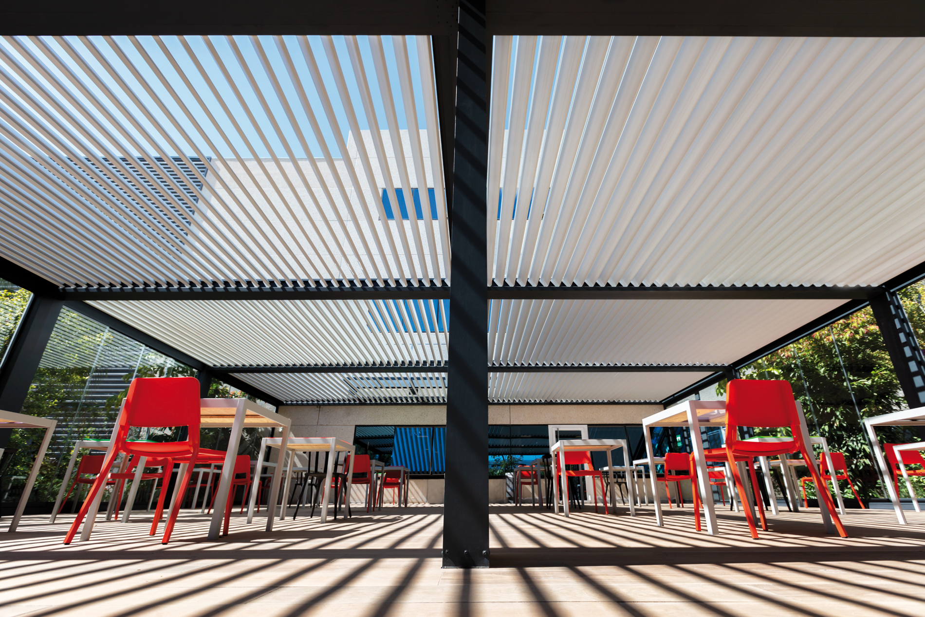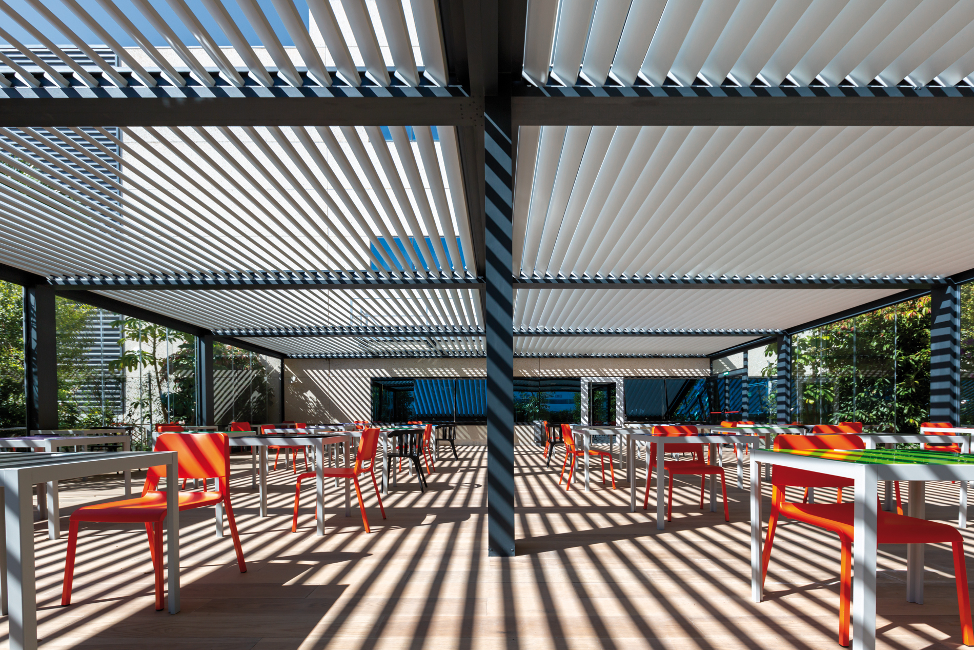 Con una estructura lacada en color RAL 9005 que contrasta a la perfección con las lamas en RAL 9010, se ha creado un rincón que utiliza la línea recta para buscar la disrupción estética con las líneas orgánicas y naturales con las que fue proyectado el interior de las oficinas. Las lamas móviles hasta 135º, el sellado del sistema perimetral del producto y el sistema de evacuación de las aguas, ayuda a que el espacio se pueda utilizar tanto en los días más calurosos como en días lluviosos.