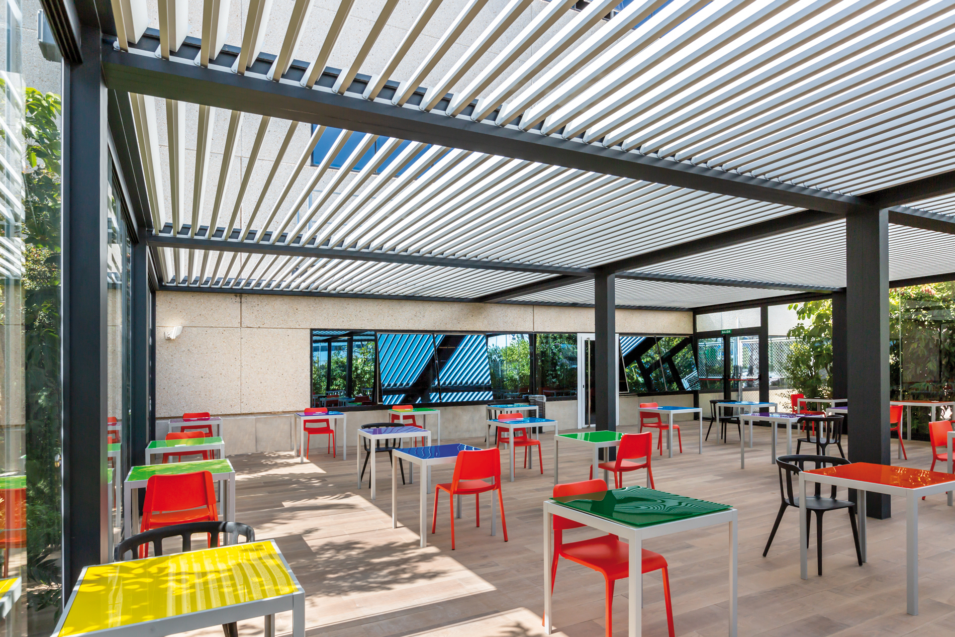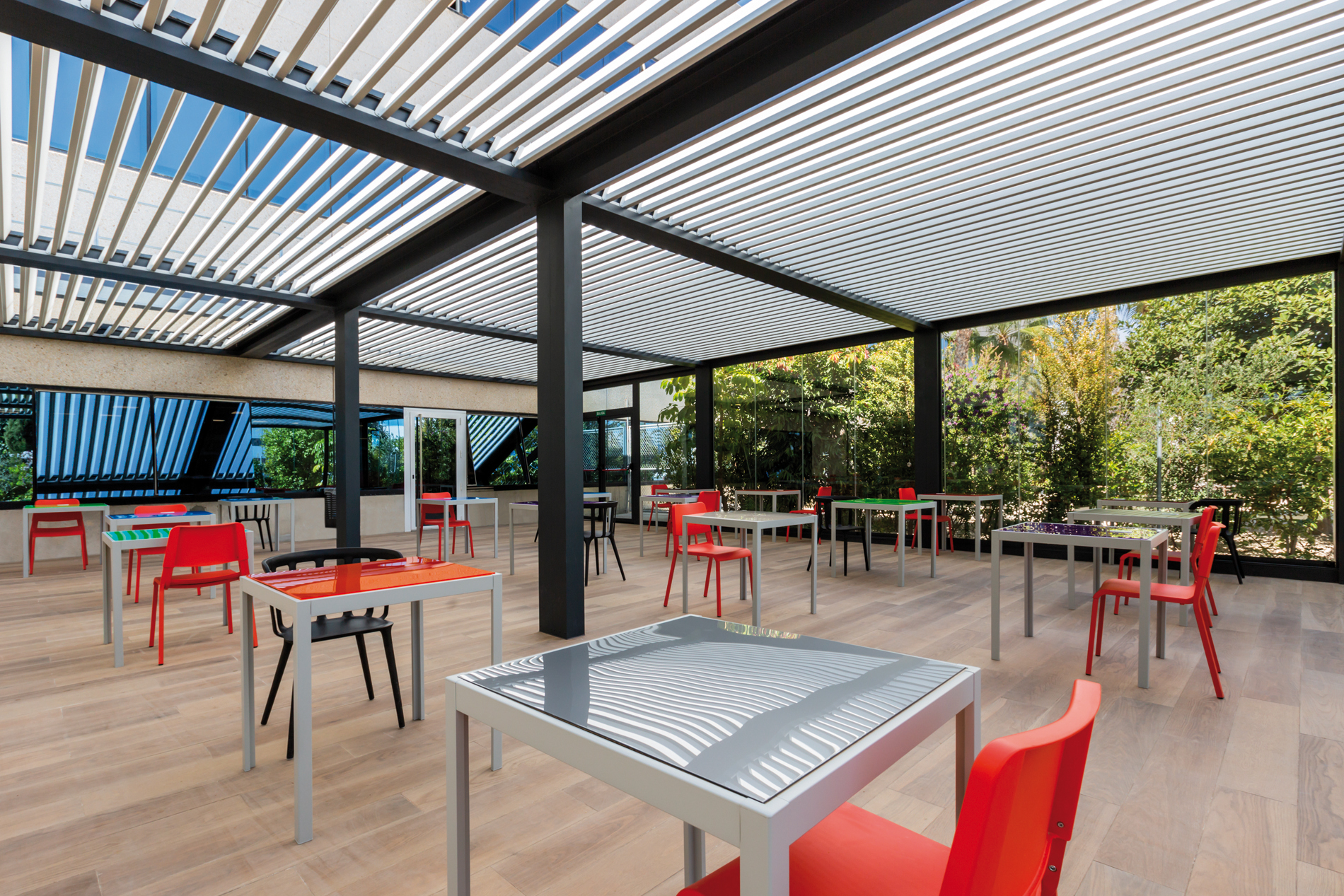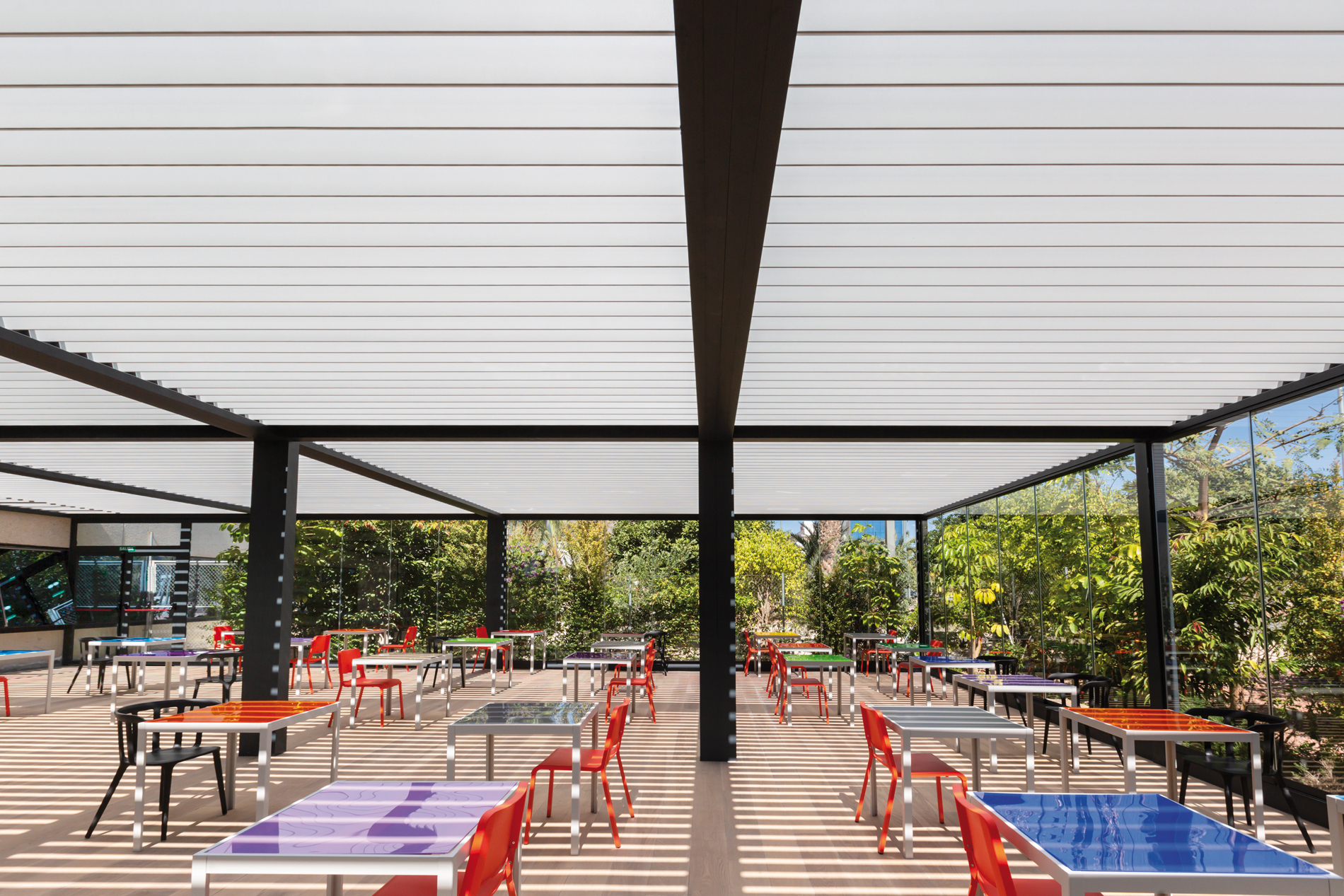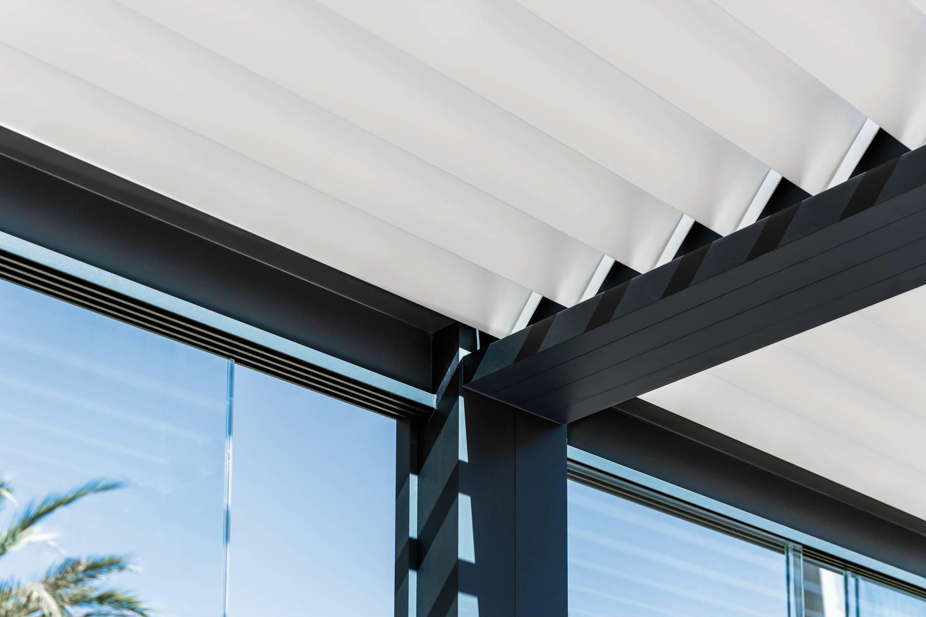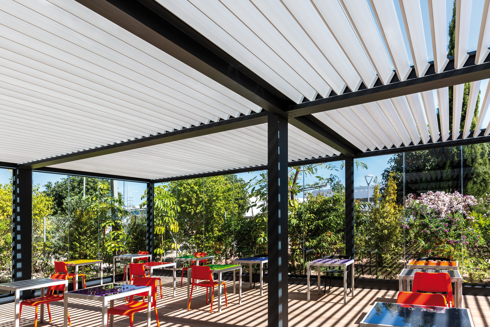 Con una estructura lacada en color RAL 9005 que contrasta a la perfección con las lamas en RAL 9010, se ha creado un rincón que utiliza la línea recta para buscar la disrupción estética con las líneas orgánicas y naturales con las que fue proyectado el interior de las oficinas. Las lamas móviles hasta 135º, el sellado del sistema perimetral del producto y el sistema de evacuación de las aguas, ayuda a que el espacio se pueda utilizar tanto en los días más calurosos como en días lluviosos.