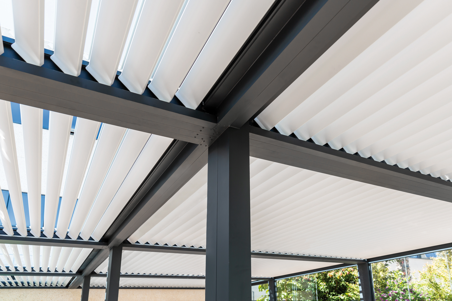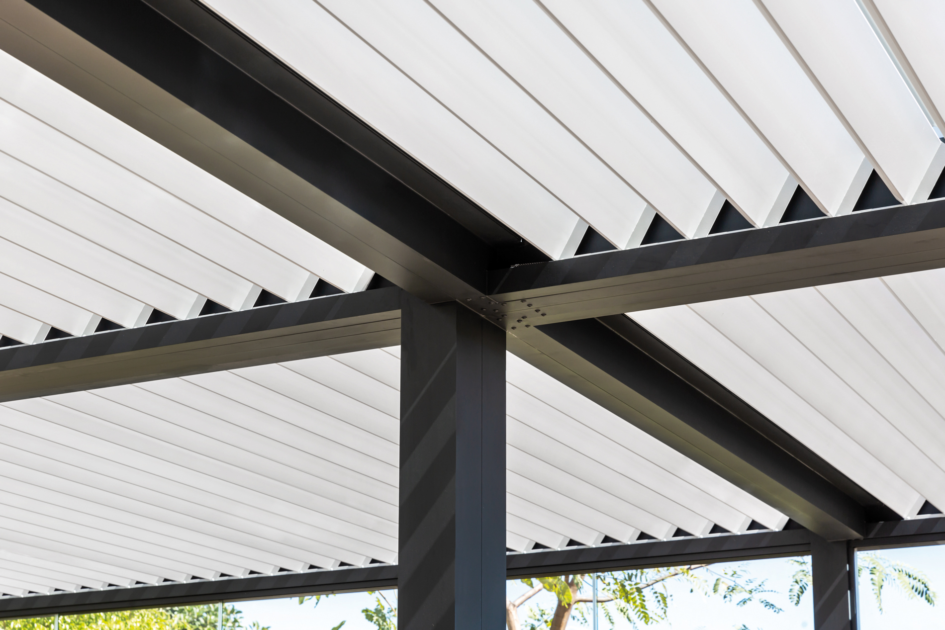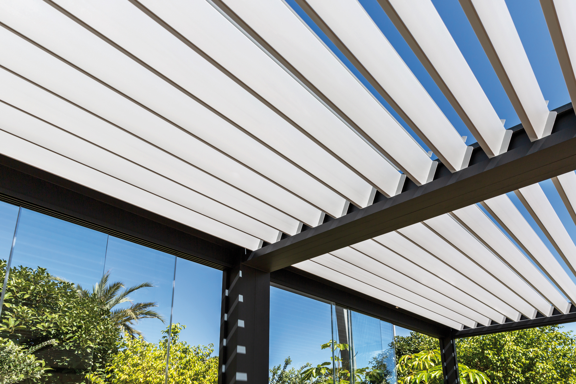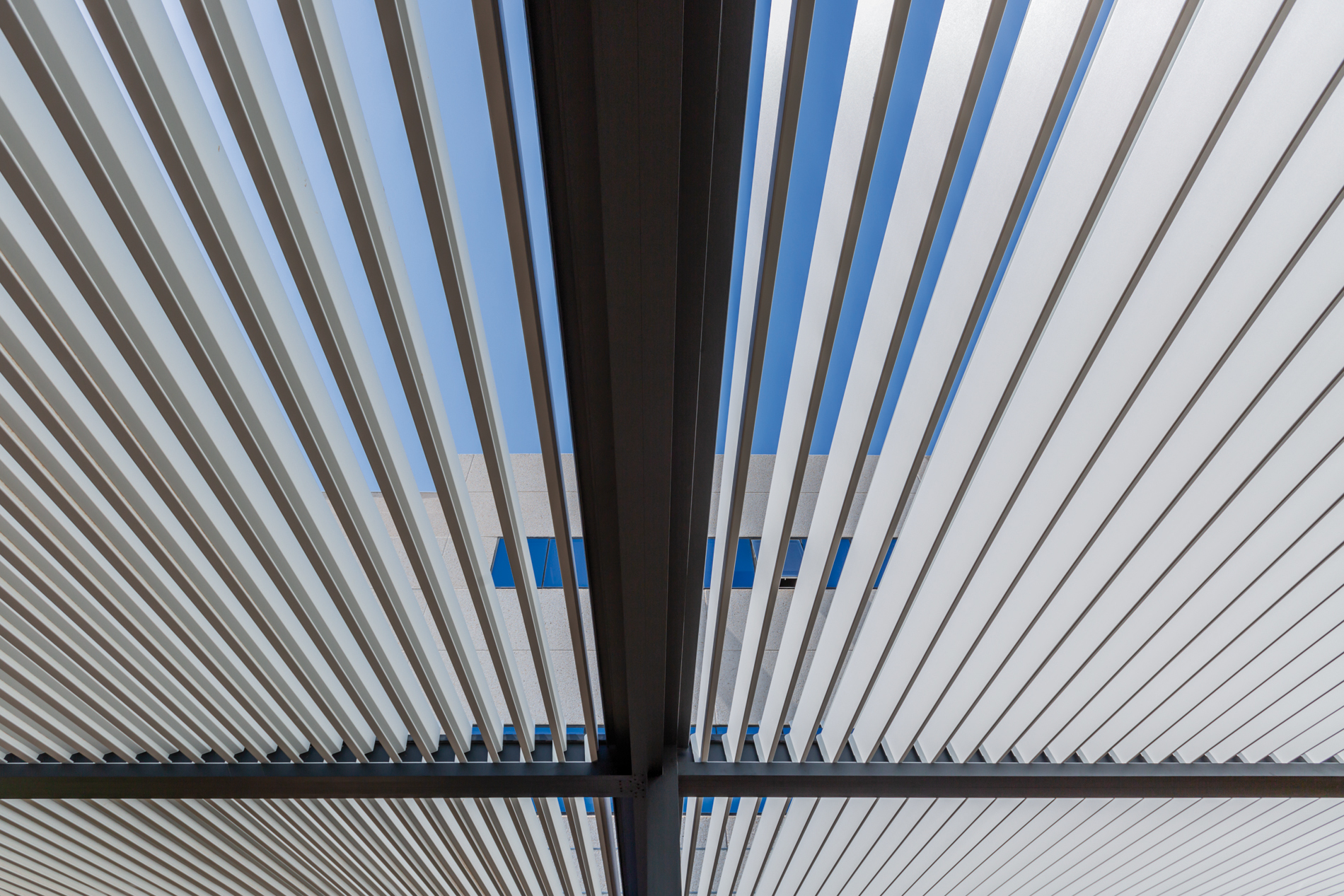 Con una estructura lacada en color RAL 9005 que contrasta a la perfección con las lamas en RAL 9010, se ha creado un rincón que utiliza la línea recta para buscar la disrupción estética con las líneas orgánicas y naturales con las que fue proyectado el interior de las oficinas. Las lamas móviles hasta 135º, el sellado del sistema perimetral del producto y el sistema de evacuación de las aguas, ayuda a que el espacio se pueda utilizar tanto en los días más calurosos como en días lluviosos.