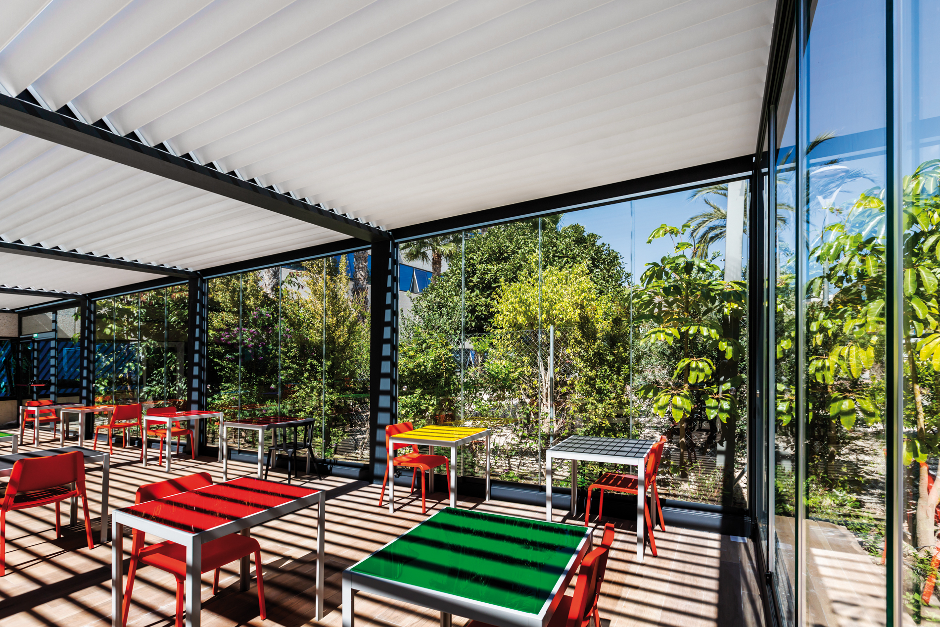 La instalación de ocho Pérgolas Bioclimáticas P-150 cerradas por Cortina de cristal correderas Iras amplía y protege este espacio de comedor corporativo.