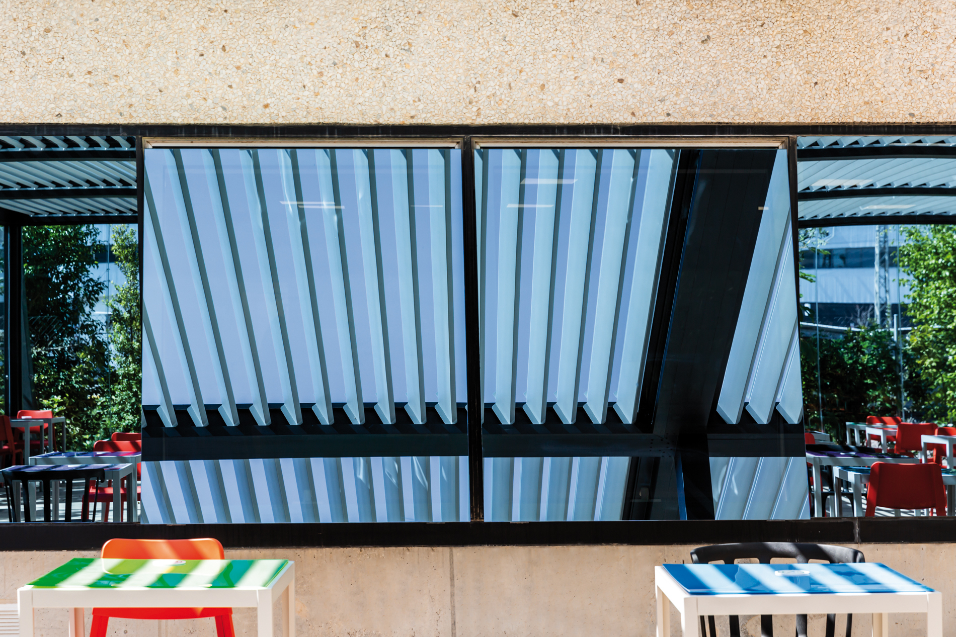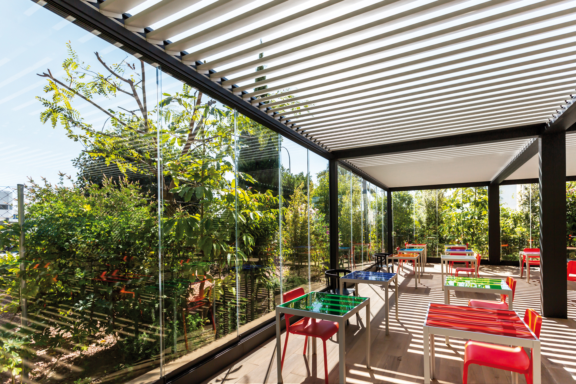 Allí, en un entorno en el que no hay ningún tipo de espacio de esparcimiento cercano para el descanso de los trabajadores, la empresa ha decidido crear un espacio protegido para que los trabajadores puedan comer, charlar o disfrutar de un café en su tiempo de desconexión. Para lograrlo, ocho pérgolas bioclimáticas cerradas por la cortina de cristal Astron y que amplían al doble de su tamaño el espacio de la cantina corporativa.