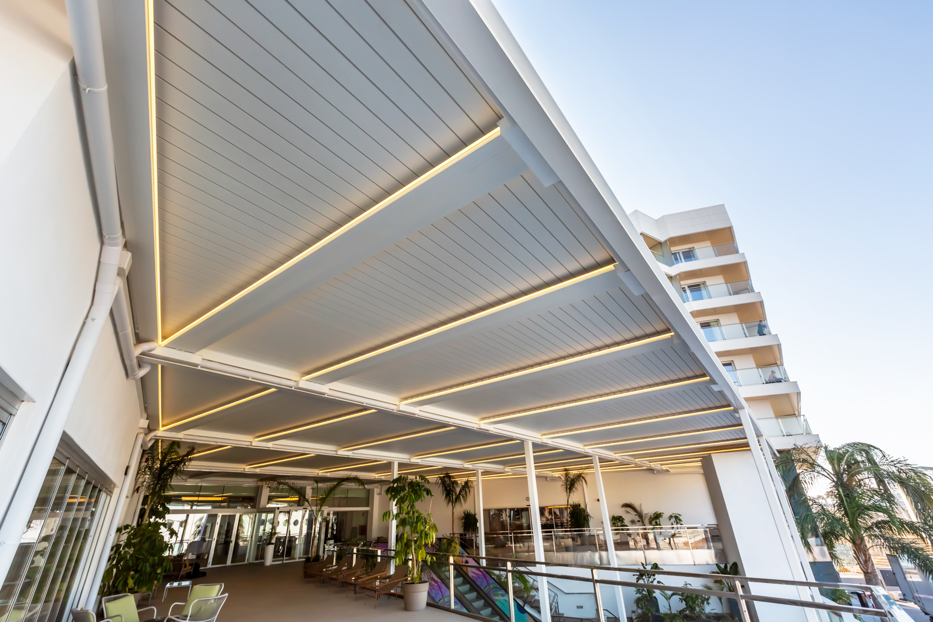 El proyecto se ha desarrollado con 32 pérgolas bioclimáticas diseñadas, fabricadas e instaladas a medida, adaptándose a los requerimientos arquitectónicos y funcionales del entorno.